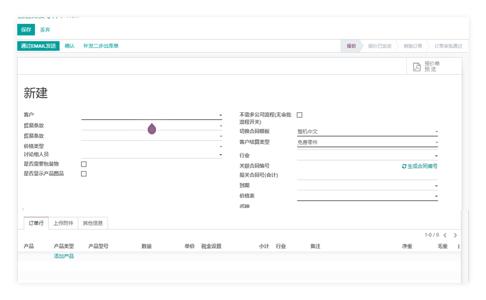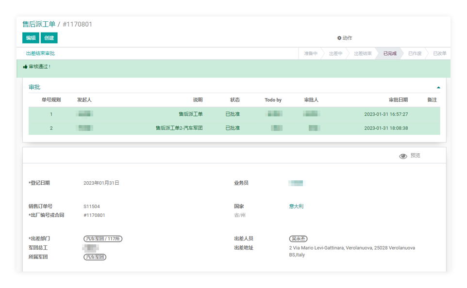 具备多类型派工单的制作,如打样申请派工单、客户交机派工单 等。同样由业务人员创建,推送后续部门执行。