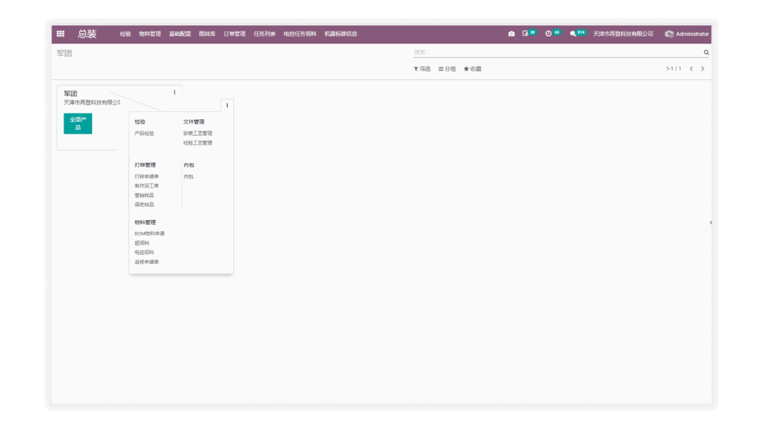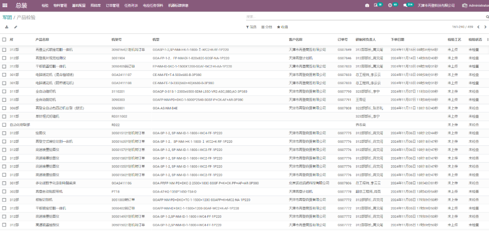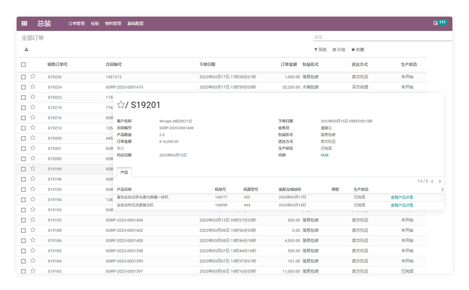 辅助工厂进行整机组装的,可以在模块中进行订单、产 品详情的查看,还有物料管理、打样管理、产品检验等