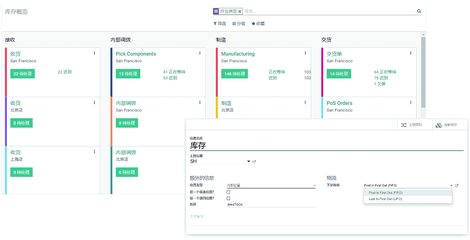 为仓库创建多个位置,分类存放产品、原材料、半成品等,并设置位置类型、下架策略〈如先进先出、后进先出等),系统按照在此处的设置,计算先出哪个批次的货物。